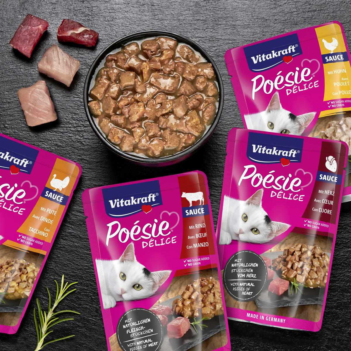 Die Vitakraft® Poésie® DÉLICE Produkte überzeugen durch natürliche, hochwertige Fleisch oder Fischstückchen.