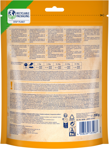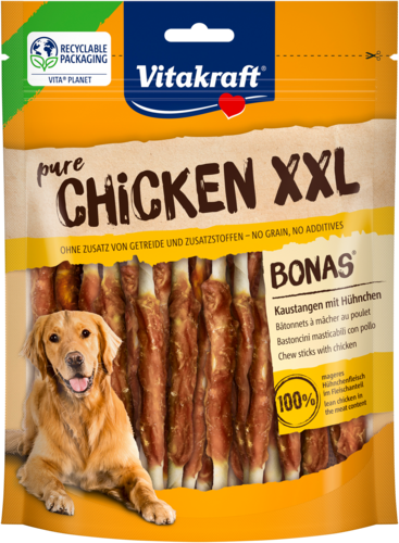 Qu'est-ce qui rend un os à mâcher irrésistible ? S'il est enveloppé de viande, bien sûr ! Découvrez le Chicken Bonas XXL de Vitakraft. De gros os de calcium recouverts de viande de poulet. Une merveilleuse surprise pour tous les amateurs de viande ! De plus, cet en-cas pour chiens ne contient ni céréales, ni soja, ni œufs, ni farine de viande et d'os. Un pur régal pour tout coquin !