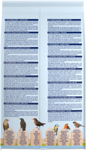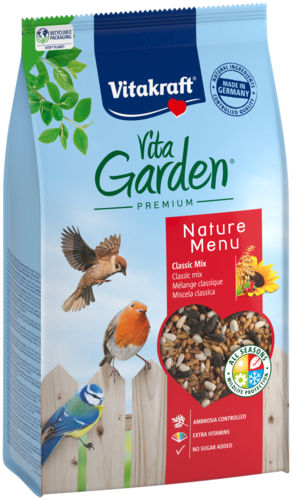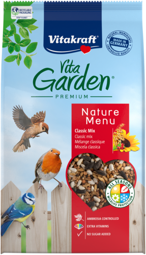 Vita Garden® Classic Mix permet de compléter facilement l'alimentation tout au long de l'année. Cette nourriture à dispersion est un complément sain à l'alimentation naturelle des oiseaux de jardin et d'extérieur. Le Classic Mix de Vitakraft contient, entre autres, de l'avoine savoureuse et des graines de rose musquée et de tournesol. Les oiseaux y puisent, entre autres, des protéines, des huiles, des fibres, des vitamines et des minéraux. Le mélange fournit à tous les oiseaux de jardin des nutriments vitaux et des vitamines importantes (A et D). Parfaitement adapté aux besoins de nombreuses espèces d'oiseaux sauvages.