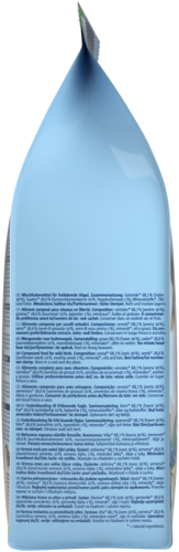 céréales (avoine 32,0%), graines (graines de tournesol 10,0%, graines d'églantier 1,0%), substances minérales, huiles et graisses