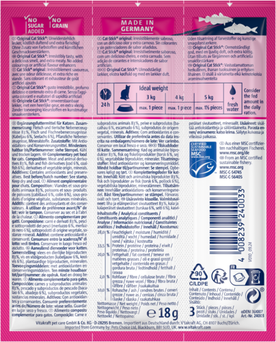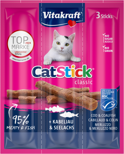 Le Cat Stick® classic au cabillaud et colin va vous séduire par son excellente qualité, sa teneur en viandes et poissons extrêmement élevée (95%), sa recette sans sucre ainsi que par son goût unique et irrésistible sans exhausteurs de goût. Il présente des petites marques de prédécoupage très pratiques pour fractionner plus facilement les bâtonnets en petits morceaux. 3 bâtonnets emballés individuellement pour conserver toute la fraîcheur du produit.