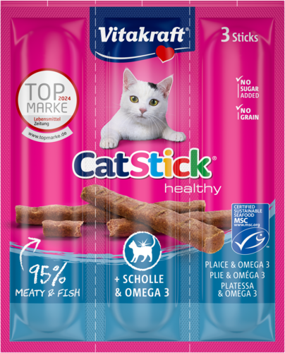 Vous êtes à la recherche d'un délicieux en-cas pour chat qui contribue également à la santé de votre roi des lions ? Découvrez alors le populaire Cat Stick Healthy avec de la plie et des oméga 3. Un irrésistible bâtonnet pour chat à forte teneur en poisson qui fera ronronner de bonheur le membre de votre famille. Ce snack pour chats ne contient ni céréales, ni sucres ajoutés, ni colorants artificiels, ni exhausteurs de goût.