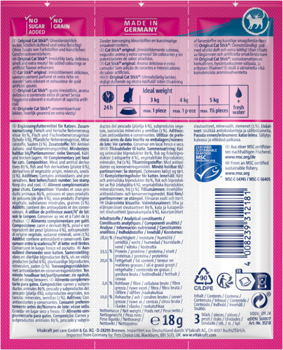 Ce Cat Stick Healthy a un effet bénéfique sur la peau et le pelage du chat. Ce snack pour chat responsable est doté de points de rupture pratiques qui permettent de donner le bâtonnet en petits morceaux. Les bâtonnets sont conditionnés par trois, emballés individuellement dans du papier d'aluminium pour garantir la fraîcheur du Cat Stick Healthy.