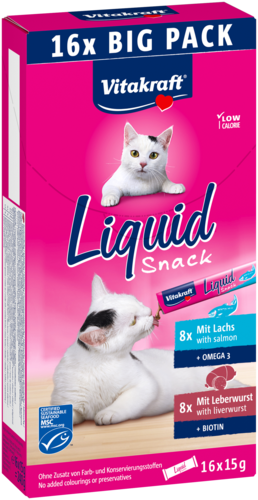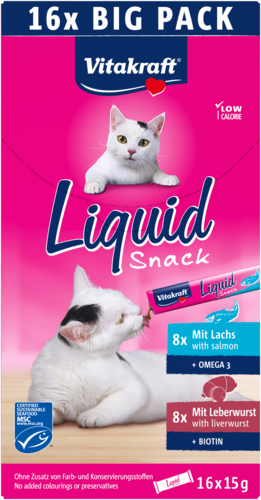 Vous trouverez également la saveur saucisse de foie dans ce multipack. Ce snack liquide de Vitakraft n'est pas seulement savoureux, il contribue également à un pelage brillant et à une peau saine. En effet, cette variante de Liquid Snack contient de la biotine.