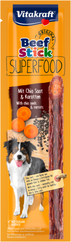 Tant les chiens que leurs maîtres adorent le Beef Stick Superfood de Vitakraft qui séduit par son excellente qualité, son odeur irrésistible et son goût inimitable. Les carottes contiennent beaucoup de fibres et sont des antioxydants qui aident à neutraliser les radicaux libres. Les graines de chia sont quant à elles naturellement riches en acides gras oméga-3 pour une peau saine et un poil brillant. A donner comme récompense, friandise ou petit encas! Snack incontournable grâce à ses super-aliments fonctionnels.