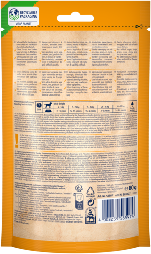 La teneur en viande est composée à 100 % de viande de poulet maigre, ce qui rend ce snack pour chiens irrésistible. De plus, cette friandise Vitakraft est exempte de céréales, de soja, d'œufs et de farine de viande. De vrais moments de plaisir en perspective !