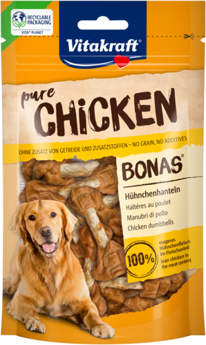 Votre chien commence-t-il à se lécher les babines à l'odeur et à la vue de la viande ? Alors surprenez votre gourmand avec les haltères de poulet Vitakraft. Des snacks à la viande savoureux et sans additifs. Ce qui signifie donc ni sucres ajoutés, ni colorants artificiels, ni exhausteurs de goût, ni conservateurs. Un pur délice !
