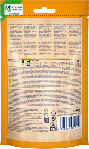 Comment rendre la mastication d'un os encore meilleure ? Des os enveloppés de viande ! Avec le Lamb Bonas de Vitakraft, votre fan de viande pourra profiter de délicieux os de calcium recouverts de viande d'agneau. Ce snack pour chiens est riche en protéines et ne contient ni céréales, ni soja, ni œufs, ni farine de viande et d'os. Une collation irrésistible pour tous les chiens !