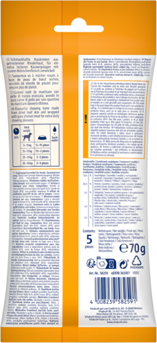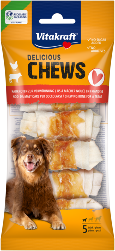 Votre chien est-il obsédé par vos baskets préférées ? Vitakraft propose la solution idéale pour sauver votre collection de chaussures. Gâtez votre compagnon à quatre pattes avec les nœuds à mâcher de Vitakraft. Cette douceur se compose de peau de bœuf séchée enrobée de délicieux poulet.