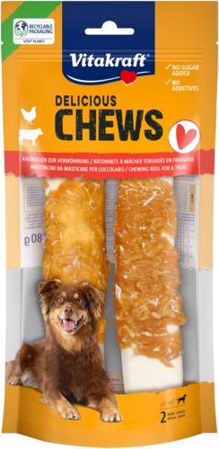 Votre chien mastique-t-il le pied de votre table sans jamais en avoir assez ? Détournez l'attention de ce chenapan avec les irrésistibles rouleaux à mâcher de Vitakraft. L'os est fait en peau de bœuf séchée et est enrobé de poulet pur.
