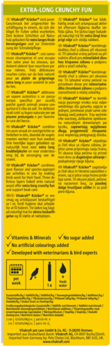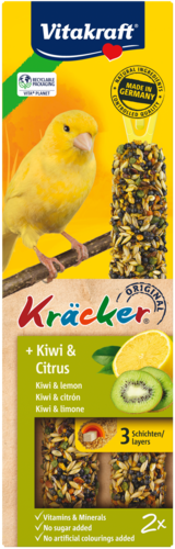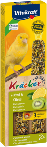 Le Kräcker® Vitakraft original est une friandise responsable aux graines, aux céréales, au kiwi et au citron sur un bâton de bois naturel qui peut être picoré. Le Kräcker® a un goût délicieux et est cuit 3 fois pour bien fixer les ingrédients et permettre au canari de rester actif et se dépenser tout comme il le ferait dans la nature. Il stimule l'activité de l'oiseau et lui permet d'user son bec de façon naturelle. Le Kräcker® est adapté aux besoins nutritionnels des canaris. Contient des vitamines essentielles et est fabriqué selon une recette sans sucre.