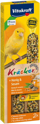 Le Kräcker® Vitakraft original est une friandise responsable aux graines, aux céréales, au sésame et au miel sur un bâton de bois naturel qui peut être picoré. Le Kräcker® a un goût délicieux et est cuit 3 fois pour bien fixer les ingrédients et permettre au canari de rester actif et se dépenser tout comme il le ferait dans la nature. Il stimule l'activité de l'oiseau et lui permet d'user son bec de façon naturelle. Le Kräcker® est adapté aux besoins nutritionnels des canaris. Contient des vitamines essentielles et est fabriqué selon une recette sans sucre.