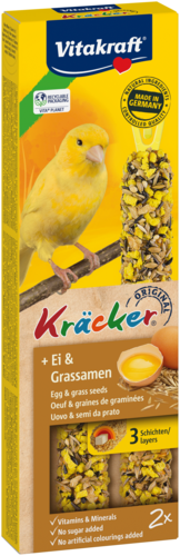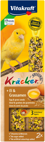 Le Kräcker® Vitakraft original est une friandise responsable aux céréales, aux graines, aux graminées et aux oeufs sur un bâton de bois naturel qui peut être picoré. Le Kräcker® a un goût délicieux et est cuit 3 fois pour bien fixer les ingrédients et permettre au canari de rester actif et se dépenser tout comme il le ferait dans la nature. Il stimule l'activité de l'oiseau et lui permet d'user son bec de façon naturelle. Le Kräcker® est adapté aux besoins nutritionnels des canaris. Contient des vitamines essentielles et est fabriqué selon une recette sans sucre.