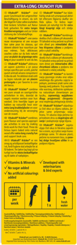 Le Kräcker® Vitakraft original est une friandise responsable aux céréales, aux graines, aux noix et aux dattes sur un bâton de bois naturel qui peut être picoré. Le Kräcker® a un goût délicieux et est cuit 3 fois pour bien fixer les ingrédients et permettre au perroquet de rester actif et se dépenser tout comme il le ferait dans la nature. Il stimule l'activité de l'oiseau et lui permet d'user son bec de façon naturelle. Le Kräcker® est adapté aux besoins nutritionnels des perroquets. Contient des vitamines essentielles et est fabriqué selon une recette sans sucre.