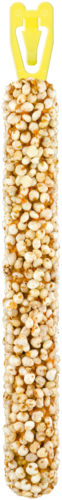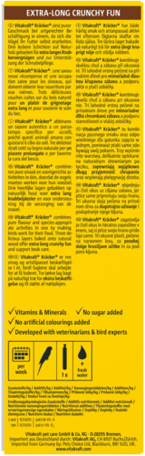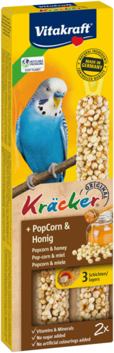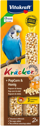 Le Kräcker® Vitakraft original est une friandise responsable aux céréales, au popcorn et au miel sur un bâton de bois naturel qui peut être picoré. Le Kräcker® a un goût délicieux et est cuit 3 fois pour bien fixer les ingrédients et permettre à la perruche de rester active et se dépenser tout comme elle le ferait dans la nature. Il stimule l'activité de l'oiseau et lui permet d'user son bec de façon naturelle. Le Kräcker® est adapté aux besoins nutritionnels des perruches. Contient des vitamines essentielles et est fabriqué selon une recette sans sucre.