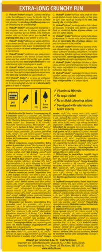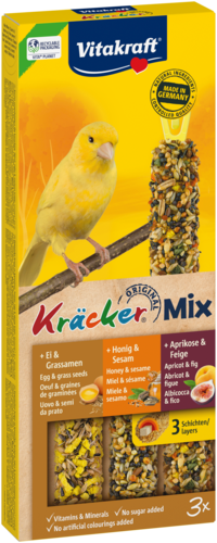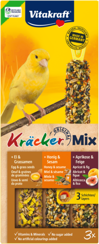 Le Kräcker® Trio Mix Vitakraft original est une friandise responsable composée de 3 Kräcker® assortis de 3 goûts différents aux oeufs, aux abricots et au miel sur un bâton de bois naturel qui peut être picoré. Le Kräcker® a un goût délicieux et est cuit 3 fois pour bien fixer les ingrédients et permettre au canari de rester actif et se dépenser tout comme il le ferait dans la nature. Il stimule l'activité de l'oiseau et lui permet d'user son bec de façon naturelle. Le Kräcker® est adapté aux besoins nutritionnels des canaris. Contient des vitamines essentielles et est fabriqué selon une recette sans sucre.