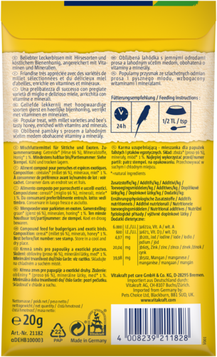 Les perles au miel sont un important complément alimentaire pour les perruches et les oiseaux exotiques. Friandise plaisir très populaire, idéale pour stimuler l'oiseau qui s'entraîne à parler et chanter. Mélange contenant du miel pur et différentes sortes de millet mûri au soleil. Enrichi en vitamines et substances minérales essentielles. Préparé sans colorants ni conservateurs.