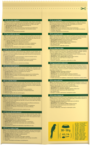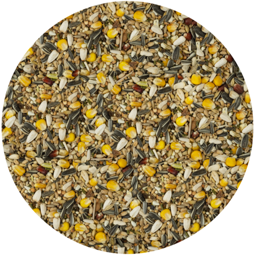céréales (maïs rouge 4,0%), graines 27,7% (graines de tournesol 20,6%), substances minérales, légumes (petit pois déshydraté 1,5%, carotte déshydratée 1,0%), noix1,0%, sous-produits d'origine végétale, miel 0,02%, huiles et graisses, levures (bêta-glucane 80 mg/kg)