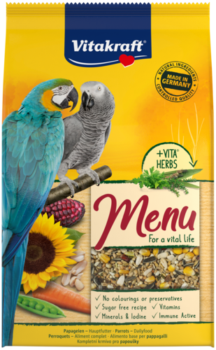 Le Menu Premium pour perroquets a été composé avec soin. Alimentation principale spécialement adaptée et équilibrée à base de graines de grande qualité, de céréales, de maïs rouge et de morceaux de carottes. Délicieux mélange qui contient tous les ingrédients dont les oiseaux ont besoin pour une vie en bonne santé. Les taux parfaitment adaptés de vitamines essentielles évitent les carences et favorisent le bien-être du perroquet. Nourriture enrichie en bêta-glucanes pour renforcer le système immunitaire de l'oiseau. Le Vital Complex iodé garantit un apport suffisant en iode, en substances minérales et en oligoéléments pour soutenir le métabolisme. L'équilibre optimal en calium et en phosphore contribue à entretenir la structure osseuse. Recette sans sucre, sans exhausteurs de goût, sans colorants ni conservateurs. Emballé dans un emballage fraîcheur refermable.