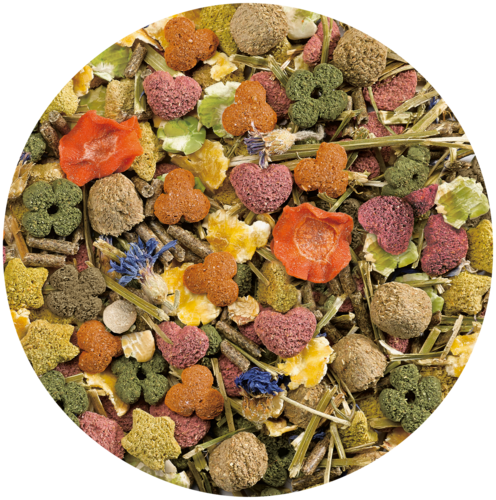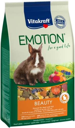 Mélange à base de luzerne riche en fibres, de carottes croquantes et de délicieuses fleurs. Emotion® Beauty Selection Adult réunit à la fois une nutrition optimale, une excellente appétence et des acides gras essentiels pour une peau saine et un beau pelage brillant. Alimentation équilibrée spécialement adaptée aux besoins nutritionnnels des lapins adultes. La composition riche en fibres brutes contribue à l'usure dentaire. Avec TriVita-Complex, innovation unique sur le marché, et Vitakraft Odour Stop pour une vie saine et heureuse. Nourriture enrichie en acide gras oméga-3 DHA, en inuline prébiotique et en acides aminés essentiels dans des proportions parfaites. Alimentation développée par des vétérinaires et des spécialistes des rongeurs. Recette sans sucre, sans arômes artificiels ni conservateurs.