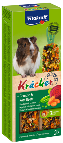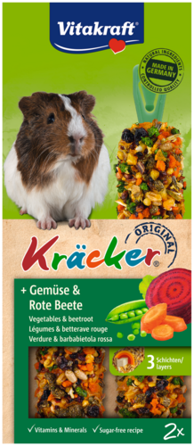 Le Kräcker® Vitakraft original est une friandise responsable aux céréales, aux légumes et aux betteraves rouges sur un bâton de bois naturel qui peut être grignoté. Le Kräcker® a un goût délicieux et est cuit 3 fois pour bien fixer les ingrédients et permettre au cobaye de rester actif et se dépenser tout comme il le ferait dans la nature. Il stimule l'activité de l'animal et lui permet d'user ses dents de façon naturelle. Le Kräcker® est adapté aux besoins nutritionnels des cobayes. Contient des vitamines essentielles, dont une dose additionnelle de vitamine C et est fabriqué selon une recette sans sucre.