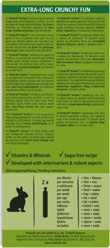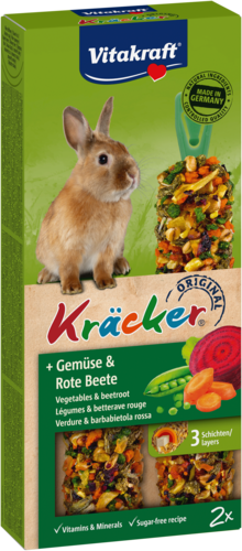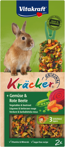 Le Kräcker® Vitakraft original est une friandise responsable aux céréales, légumes et betteraves rouges sur un bâton de bois naturel qui peut être grignoté. Le Kräcker® a un goût délicieux et est cuit 3 fois pour bien fixer les ingrédients et permettre au lapin nain de rester actif et se dépenser tout comme il le ferait dans la nature. Il stimule l'activité de l'animal et lui permet d'user ses incisives de façon naturelle. Le Kräcker® est adapté aux besoins nutritionnels des lapins nains. Contient des vitamines essentielles et est fabriqué selon une recette sans sucre.