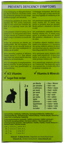 Le Kräcker® Vitakraft fonctionnel est une friandise responsable aux céréales sur un bâton de bois naturel qui peut être grignoté. Ce Kräcker® fonctionnel est enrichi en vitamines A, C et E pour éviter les carences et soutenir le système immunitaire du lapin nain. Le Kräcker® a un goût délicieux et est cuit 3 fois pour bien fixer les ingrédients et permettre au lapin nain de rester actif et se dépenser tout comme il le ferait dans la nature. Il stimule l'activité de l'animal et lui permet d'user ses incisives de façon naturelle. Le Kräcker® est adapté aux besoins nutritionnels des lapins nains. Contient des vitamines essentielles et est fabriqué selon une recette sans sucre.
