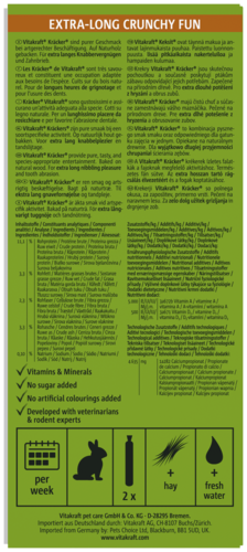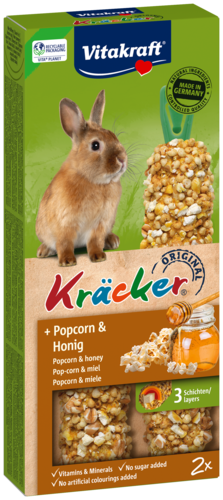 Le Kräcker® Vitakraft original est une friandise responsable aux céréales, au popcorn et au miel sur un bâton de bois naturel qui peut être grignoté. Le Kräcker® a un goût délicieux et est cuit 3 fois pour bien fixer les ingrédients et permettre au lapin nain de rester actif et se dépenser tout comme il le ferait dans la nature. Il stimule l'activité de l'animal et lui permet d'user ses incisives de façon naturelle. Le Kräcker® est adapté aux besoins nutritionnels des lapins nains. Contient des vitamines essentielles et est fabriqué selon une recette sans sucre.
