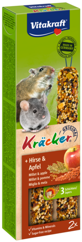 Le Kräcker® Vitakraft original est une friandise responsable aux céréales, à la pomme et au millet sur un bâton de bois naturel qui peut être grignoté. Le Kräcker® a un goût délicieux et est cuit 3 fois pour bien fixer les ingrédients et permettre au petit rongeur de rester actif et se dépenser tout comme il le ferait dans la nature. Il stimule l'activité de l'animal et lui permet d'user ses dents de façon naturelle. Le Kräcker® est adapté aux besoins nutritionnels des petits rongeurs. Enrichi en vitamines essentielles et fabriqué selon une recette sans sucre.