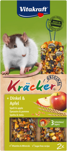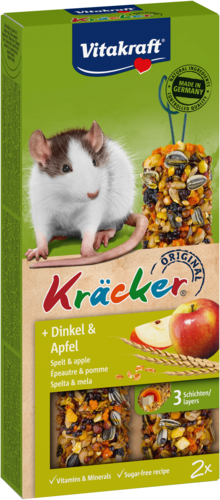 Le Kräcker® Vitakraft original est une friandise responsable aux céréales, à la pomme et à l'épeautre sur un bâton de bois naturel qui peut être grignoté. Le Kräcker® a un goût délicieux et est cuit 3 fois pour bien fixer les ingrédients et permettre au rat de rester actif et se dépenser tout comme il le ferait dans la nature. Il stimule l'activité de l'animal et lui permet d'user ses dents de façon naturelle. Le Kräcker® est adapté aux besoins nutritionnels des rats. Enrichi en vitamines essentielles et fabriqué selon une recette sans sucre.