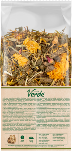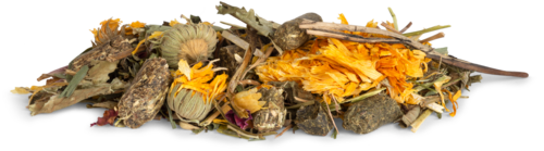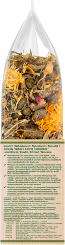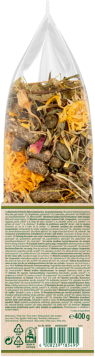 sous-produits d'origine végétale, fleur de souci 5,0%, persil déshydraté 5,0%, pissenlit déshydraté 4,0%, menthe poivrée 3,0%, feuille de rose 1,0%, substances minérales
