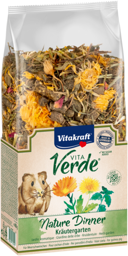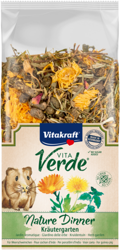 Le Nature Dinner pour cobayes aux herbes contient du persil, des feuilles d'orties et de la délicieuse menthe poivrée aromatique. Cette alimentation naturelle sans céréales est un mélange équilibré d'ingrédients naturels qui constitue la meilleure nourriture principale sans céréales. Contient toutes les vitamines et substances minérales essentielles, une dose additionnellel de vitamine C ainsi qu'une grande quantité de fibres brutes pour optimiser la digestion, conserver une flore intestinale saine et stimuler la mastication qui contribue à l'usure dentaire. Recette sans sucre, sans colorants, sans exhausteurs de goût ni conservateurs.