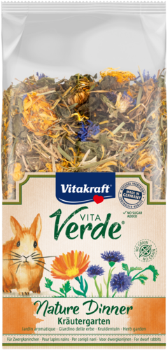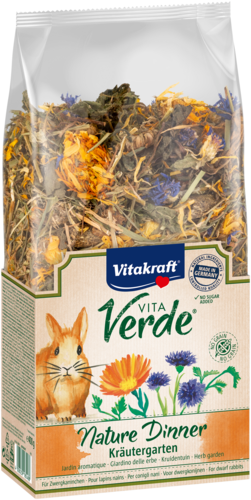 Le Nature Dinner pour lapins nains aux herbes contient du persil, des feuilles d'orties et de la délicieuse menthe poivrée aromatique. Cette alimentation naturelle sans céréales est un mélange équilibré d'ingrédients naturels qui constitue la meilleure nourriture principale sans céréales. Contient toutes les vitamines et substances minérales essentielles ainsi qu'une grande quantité de fibres brutes pour optimiser la digestion, conserver une flore intestinale saine et stimuler la mastication qui contribue à l'usure dentaire. Recette sans sucre, sans colorants, sans exhausteurs de goût ni conservateurs.