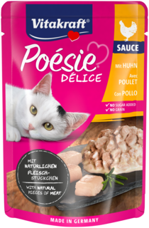 De producten van Vitakraft® Poésie® DÉLICE maken het smaakverschil met hun natuurlijke stukjes vlees of vis van hoge kwaliteit.