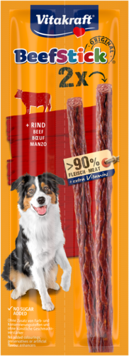 Wil je jouw hond trakteren op een snack met een zeer hoog vleesaandeel van meer dan 90% en een pure, hartige smaak? Dan is de Vitakraft® Beef Stick® Rund de ideale keuze! Deze snack is zacht gerookt op beukenhout voor een onweerstaanbare geur en een intense vleessmaak waar je hond geen genoeg van krijgt.