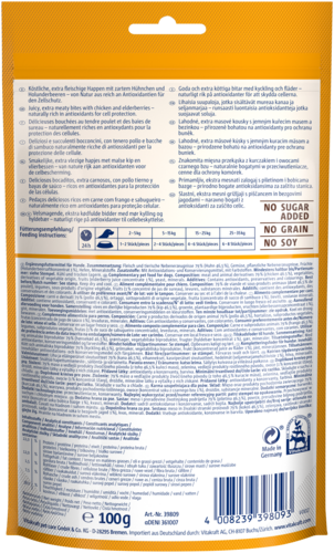 Samenstelling: Vlees en dier bijproducten 74,2% (kip 49,5%), Plantaardige bijproducten, Groenten, mineralen, gisten, vruchten (Veenbessensap concentraat 1,1%).