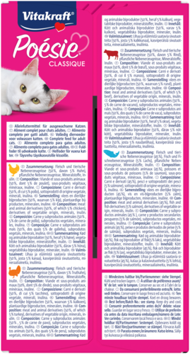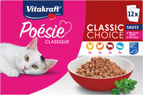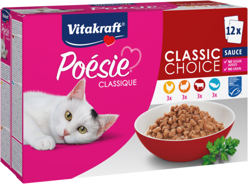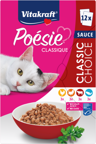 Is jouw kat een echte fijnproever die houdt van variatie? Dan is Vitakraft® Poésie® Classique de perfecte keuze! De multipack "Classic Choice" bevat 12 smakelijke porties van 85 g in vier onweerstaanbare smaken: kip, kalkoen, rundvlees en zalm. Zo geef je jouw huistijger elke dag iets nieuws om van te genieten.
