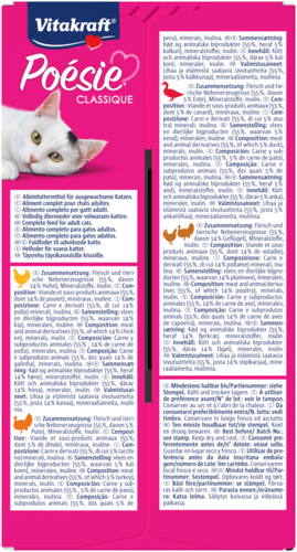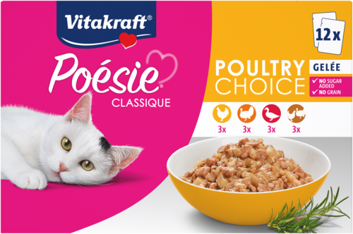 Is jouw kat een echte fijnproever die graag varieert in smaak? Dan is Vitakraft® Poésie® Classique "Poultry Choice" de ideale keuze. Deze multipack bevat 12 handige zakjes van 85 g, met vier verrukkelijke varianten in gelei: kip, gevogelte, kalkoen en eend. Zo geef je jouw huistijger elke dag een andere smaakbeleving om van te smullen.
