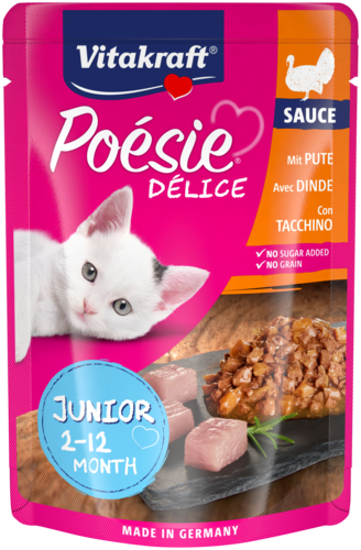 Is jouw nieuwe gezinslid een echte fijnproever? Dan zal hij dol zijn op Vitakraft® Poésie® Délice met sappige kalkoenborst in een verfijnde saus. Deze heerlijke natvoeding bevat natuurlijke, zorgvuldig geselecteerde stukjes kalkoenfilet van hoge kwaliteit – puur, mals en onweerstaanbaar lekker.