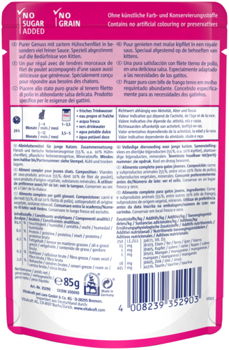 Is jouw kitten klaar voor zijn eerste culinaire avontuur? Vitakraft® Poésie® Délice Junior biedt natuurlijke, hoogwaardige stukjes kipfilet in een delicate saus – speciaal ontwikkeld voor jonge katten in de groeifase.