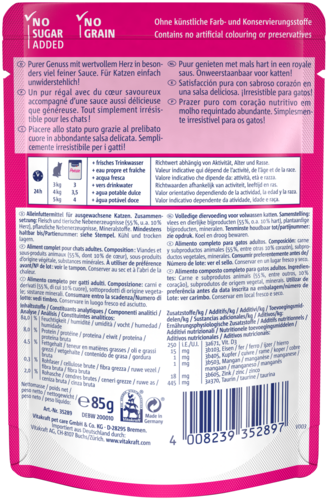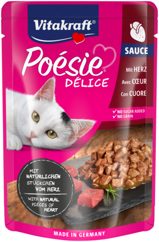 Is jouw kat een echte diva en houdt ze van luxe? Dan is Vitakraft® Poésie® Délice de perfecte traktatie! Deze heerlijke maaltijd met zachte stukjes hart in een verfijnde saus zijn een ware delicatesse, gemaakt van natuurlijke, hoogwaardige ingrediënten. Volledig afgestemd op de voedingsbehoeften van jouw kat, zonder toegevoegde suikers, granen of kunstmatige toevoegingen. Een luxe verwenmoment dat zelfs de meest kieskeurige katten niet kunnen weerstaan!