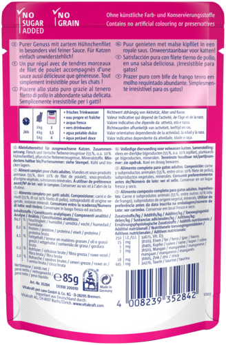 Laat jouw huistijger genieten van een verfijnde traktatie met Vitakraft® Poésie® Délice met kipfilet! Deze natvoeding bevat malse stukjes natuurlijke kipfilet in een fijne saus – een onweerstaanbare combinatie waar elke kat dol op is.