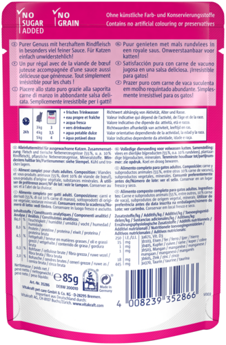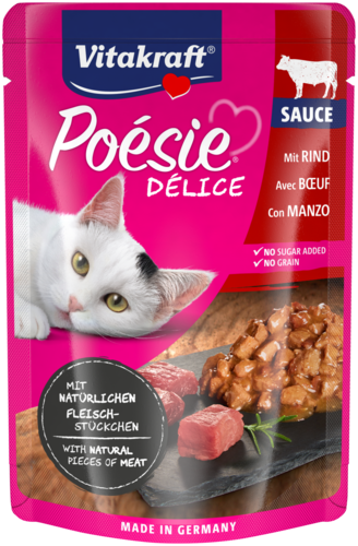 Is jouw kat dol op rundvlees? Trakteer hem dan op Vitakraft® Poésie® Délice met rund – een heerlijke maaltijd met natuurlijke, hoogwaardige stukjes rundvlees in een smaakvolle saus.