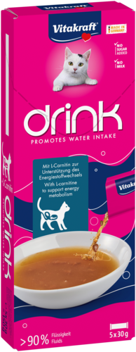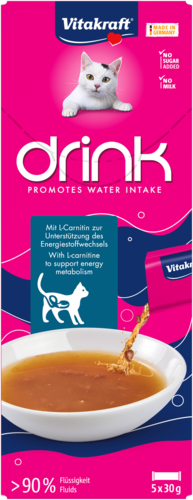 Is jouw kat een slechte drinker? Geef zijn vochtinname dan een boost met de Vitakraft® Drink! Deze onweerstaanbare drinksnack in zalmsmaak zorgt ervoor dat jouw kat al spinnend van plezier drinkt. Het overheerlijke drankje bevat L-carnitine, wat de energiestofwisseling bevordert. Dankzij de handige sachets blijft het drankje altijd vers en kun je de juiste portie geven.