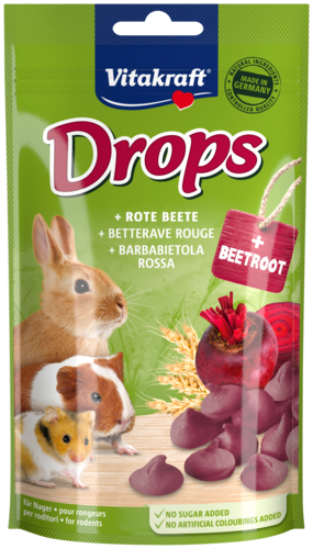 Is jouw knaagdier en konijn toe aan een smakelijke verrassing? Verwen je kleine vriend dan met de heerlijke Vitakraft® Drops met rode biet! Deze snoepjes zijn niet alleen leuk om te geven, maar ook een feest om te krijgen. De zachte, natuurlijke smaak van rode biet laat je knager snuffelen van geluk en maakt elke hap onweerstaanbaar. Bovendien zijn deze drops speciaal afgestemd op de voedingsbehoeften van je huisdier – zonder toegevoegde suikers, lactose, kunstmatige kleurstoffen en smaakversterkers. Licht verteerbaar en perfect als tussendoortje of beloning na een speelsessie. Dankzij de hersluitbare zak blijven ze lekker vers, zodat jij je konijn of knaagdier keer op keer kunt trakteren op een puur en verantwoord genietmoment!