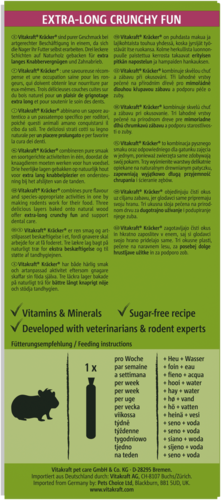 Zit jouw cavia altijd enthousiast te snuffelen zodra je iets lekkers in zijn voerbak legt? Verwen hem dan met de Vitakraft® Kräcker! Deze knapperige knabbelstick met granen, fruit en flakes zorgt niet alleen voor een smaakvolle traktatie, maar houdt je cavia ook actief, net zoals in de natuur. Doordat de ingrediënten in drie lagen op een natuurlijk knabbelhoutje zijn gebakken, blijft je kleine vriend lekker lang bezig en slijten zijn tanden op natuurlijke wijze af. De Kräcker is afgestemd op de voedingsbehoefte van cavia’s, bevat extra vitamine C voor een vitaal leven en is vrij van toegevoegde suikers. Zo trakteer je jouw harige vriend op een verantwoorde en smakelijke snack!