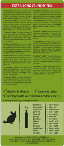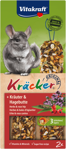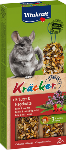 Is jouw chinchilla een echte knabbelliefhebber? Dan zijn de Vitakraft® Kräcker met heerlijke zaden en kruiden dé perfecte traktatie! Deze knapperige snacksticks zijn drielaags gebakken en stevig bevestigd op een natuurlijk knabbelhoutje, waardoor je chinchilla lekker lang bezig is, net als in de natuur. De combinatie van granen, kruiden en rozenbottel zorgt voor een smaakvolle variatie en draagt bij aan de noodzakelijke tandslijtage. Bovendien bevatten de Kräckers essentiële vitamines en geen toegevoegde suikers, zodat je je harige vriend met een gerust hart kunt verwennen. Pure knabbelpret voor een vitaal chinchillaleven!
