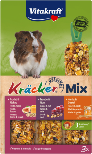 De Vitakraft® Kräcker® Mix is een verantwoorde lekkernij voor je cavia, verrijkt met essentiële vitamines en extra vitamine C. Bovendien worden de Kräckers bereid zonder toegevoegde suikers, zodat je cavia verantwoord kan genieten van zijn favoriete snack.