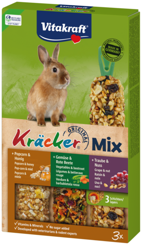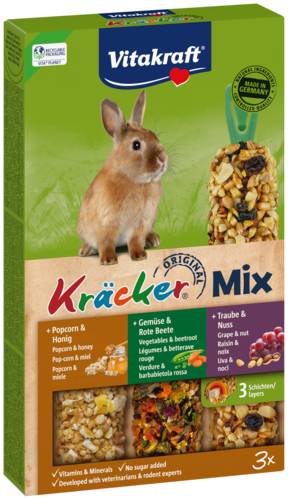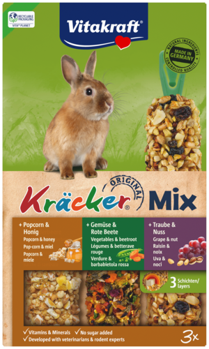 Tijd voor een smakelijke verrassing! Deze Vitakraft® Kräcker® mix combineert heerlijke smaken met een natuurlijke, soortspecifieke activiteit voor je dwergkonijn.
