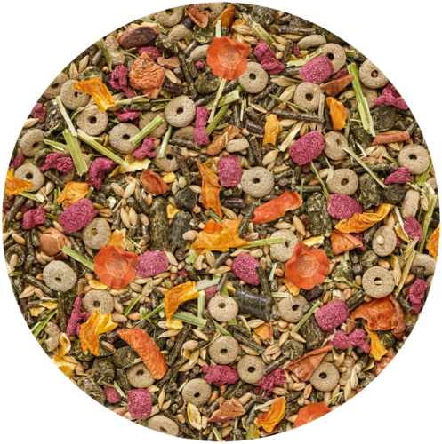 Samenstelling: Gerst*, Tarwe*, Gras, gedroogd*, luzerne* 10,5%, tarwezemelen*, Bietenmelassepulp, zonnebloemkoek, haverschillen*, haverzemelengrint*, maïsvlokken*, koolzaadschroot, Moutkiemen*, Mais*, maïsmeel*, pompoenrepen* 1%, Wortelen, gedroogd* 1%, appel, gedroogd* 1%, pepermuntbladeren, gedroogd* 0,8%, Tarwemeel*, havermeel*, calciumcarbonaat*, tijm, gedroogd* 0,5%, kamillebloesem, gedroogd* 0,27%, Rode biet concentraat* 0,22%, koolzaadolie, Hibiscusbloemen, gedroogd* 0,18%, natriumchloride*, inuline*, zonnenbloemolie, yucca Schidigera poeder*. *=Natuurlijke ingrediënten